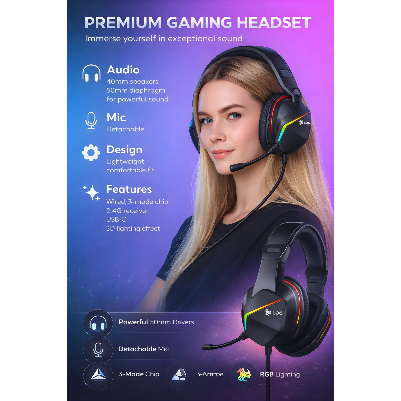 • 50 mm Drivers – Deep bass and clear highs for immersive gaming.