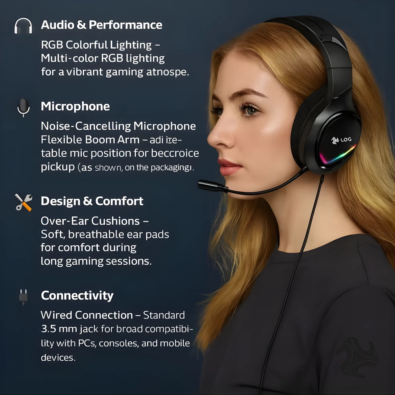 • Noise-Cancelling Mic – Omni-directional, flexible boom for clear voice.